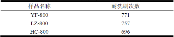 從表中 可以看出,采用永豐大方解石加工的YF-800 制備的乳膠漆漆膜的耐洗刷次數最高,達到771 次,其次是采用永豐大方解石加工的LZ-800,其耐洗刷次數為757 次,與YF-800 相當,采用海城白云石生產的HC-800 制備的乳膠漆的漆膜耐洗刷性能最差,耐洗刷次數為696 次,但均大于500 次,完全符合國家標準。