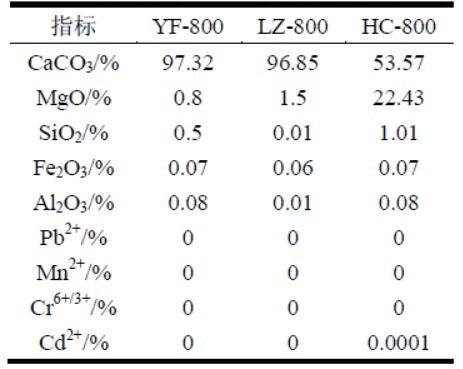 從表中結果可以看出,江西永豐大方解加工的YF-800 碳酸鈣含量最高,雜質元素和重金屬含量最低;連州小方解加工的LZ-800 的SiO2 最低,相對而言對加工設備的磨損也會低;海城白云石加工的HC-800,其成分為典型的白云石成分,其中MgO的含量較多,達到22.43%,碳酸鈣的純度較低,因此粉體一些性能可能會受到影響。