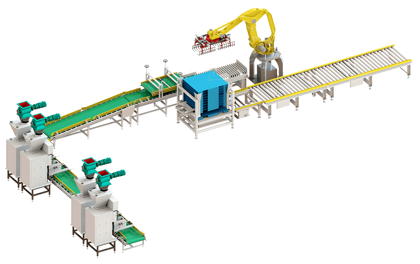 采用機器人自動碼垛的生產線,通過計算機程序控制,能夠實現自動包裝、落袋、輸送、整形、調整、碼垛、壓垛等功能,同時可根據客戶產品及工藝要求個性化設計。生產過程勞動力少、節省空間、運作靈活精準、快速高效。廣泛應用于電力、冶金、水泥、化工、非金屬礦等行業的制粉儲運中,如:滑石粉、重晶石、方解石、高嶺土、鈦白粉、石灰石、膨潤土、鐵礦石等。