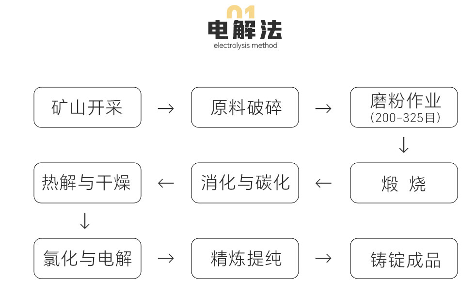 礦山開采→原料破碎→磨粉作業(200-325目)→煅燒→消化與碳化→熱解與干燥→氯化與電解→精煉提純→鑄錠成品